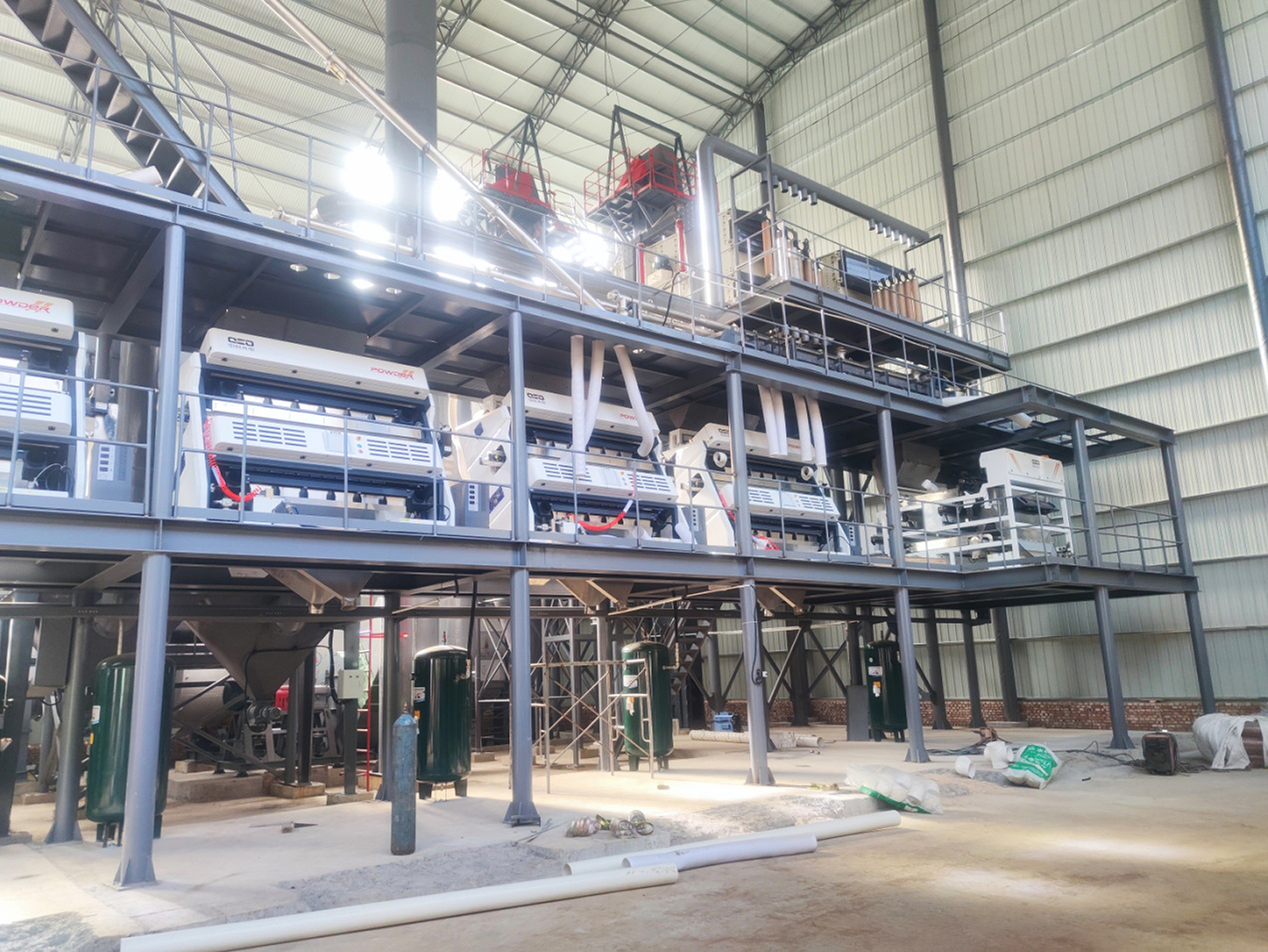 石英砂生產(chǎn)線成套設(shè)備由上料存儲(chǔ)系統(tǒng)、破碎系統(tǒng)、濕法除鐵系統(tǒng)、脫水系統(tǒng)、烘干系統(tǒng)、提升篩分系統(tǒng)、色選系統(tǒng)、干法除鐵系統(tǒng)、除塵系統(tǒng)、噸包包裝系統(tǒng)、氣路系統(tǒng)、電路系統(tǒng)及自動(dòng)化控制系統(tǒng)組成。